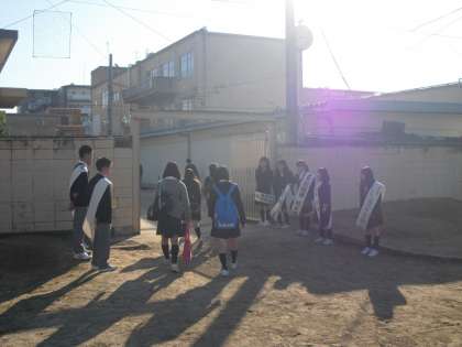 新生徒会本部メンバー選出に向け,立候補した16名が朝早くから校門前で選挙運動を行っています。登校する生徒に支持を訴えていました。