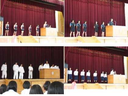 7月5日(月)6限,体育館で全校生徒による「夏季大会激励会」が開催されました。各部ユニフォーム姿で入場し,生徒会代表からの激励挨拶を受けた後,各クラブごとにステージに上がり,キャプテンから大会に向けての決意表明を次々に行いました。最後に「校歌」を斉唱し,お互いの奮闘を誓いあいました。