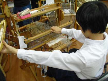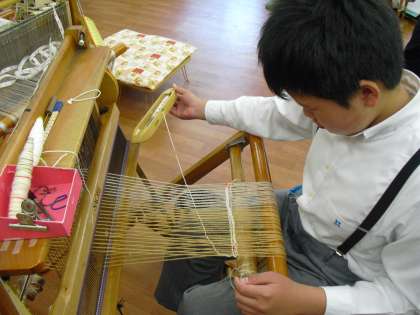初めての体験に緊張気味の1年生も、2度目の体験に自信たっぷりな2年生も、伝統工芸の「組みひも」や「さおり織り」に挑戦しています。