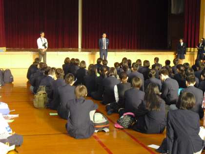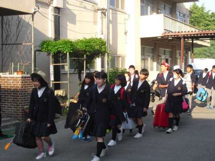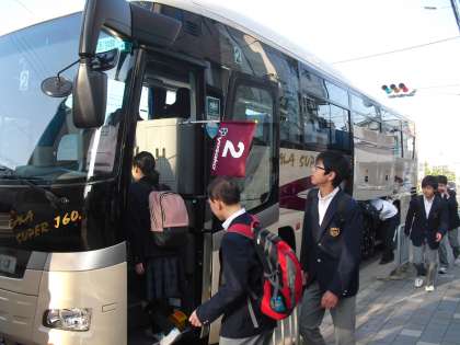 5月21日、朝6時に体育館に集合。結団式から修学旅行がスタートします。さすがに眠そうな様子もちらほら。でも、これから迎える3日間にワクワクする思いがそれぞれの目に宿っていました。学校を出て、御池通りからバスに乗り込みます。