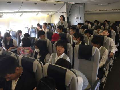 飛行機に乗り込み、さあ一路沖縄へ!こころもちみんなの表情が硬い気がするのは、私だけでしょうか…?
