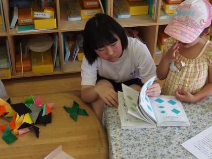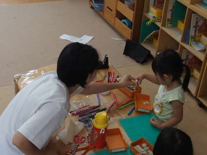 光明幼稚園です。小さい子に対するときは、その子の目線でわかりやすい言葉で丁寧に…。お姉ちゃん先生として活躍しています。
