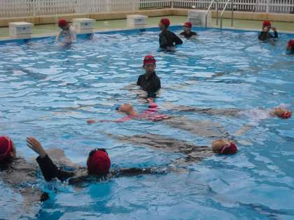 「重いー!!」「泳げへーん!!」そんな声がプールに響きます。