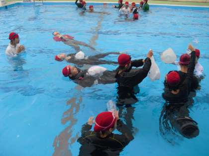 服を着たまま、浮いたり、泳いだり、はたまた着ている服を脱いだり…。いろいろなことを水中で試します。