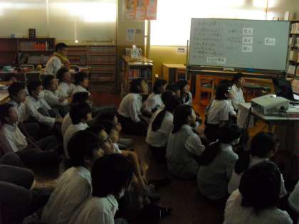 この時間の美術は対話型鑑賞。プロジェクターで大写しにされた絵を見て、みんなで考えます。