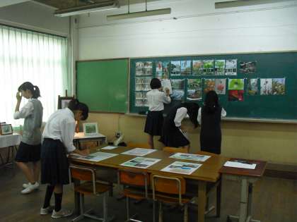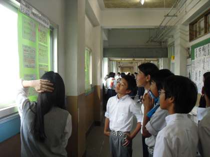 日頃の学習の取り組みの成果や作品の数々が所狭しと並べられています。地域の方が作られた作品もあります。