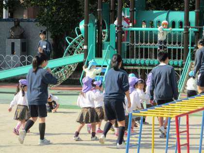 3年家庭科で取り組んでいる保育実習は今日が最終日。園児も「今日はどんなお姉さん,お兄さんが来てくれるのかなぁ」と期待していました。すぐに打ち解けて園庭で一緒に遊んだり,手をつないでお散歩に行ったり,お部屋でおんぶをせがまれたり。あっと言う間に時間が過ぎて,最後に合唱コンクールで歌った歌を披露して保育実習を締めくくりました。