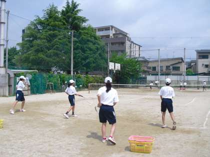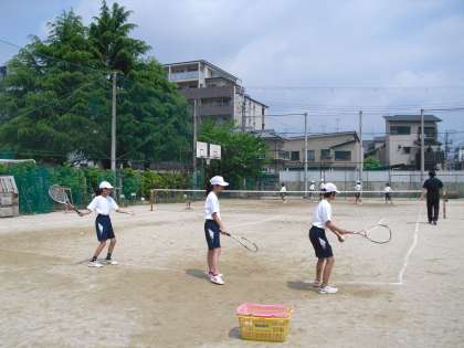 上級生が練習試合に出かけ、専用になったコートで1年生が基本練習を繰り返していました。入部した頃より、ずいぶん打球の音が変わってきた気がします。顧問の先生から競技のセオリーを教わり、それができるように練習で身につけていきます。