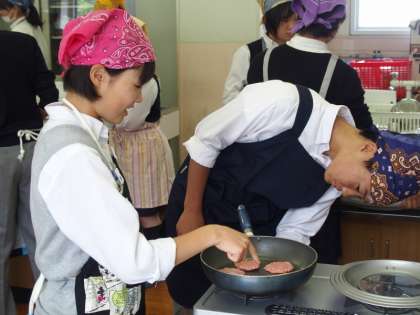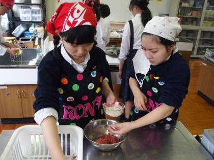 実習では、初めてひき肉をさわる生徒、焼き加減を慎重に確認する生徒など、それぞれが楽しんで取り組んでいる様子でした。ケチャップ、マヨネーズで味付けし、おいしそうに試食していました。担任の福田先生も、「うまい!!これなら200個はいける!」と太鼓判でしたよ。