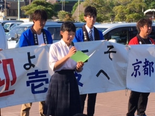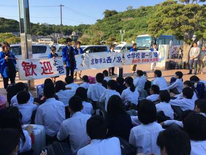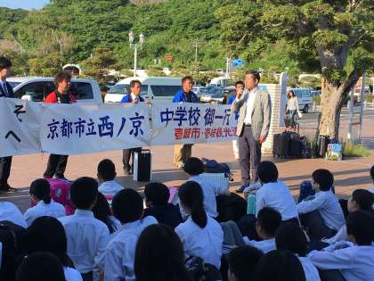 校長先生や生徒代表のあいさつもありました。このあと、バスに分乗してそれぞれの民宿に向かいます。