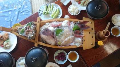 おっ!1・4、5組の男子がいる近海荘でも、夕食が始まりました。各テーブルに舟盛りがドーンと置かれ、腹ペコのみんなも大喜びです。