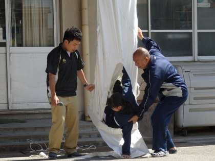 北階段が使えなくなったときは、垂直降下袋の使用が考えられます。そこで、先生と生徒の代表に避難器具による避難を体験してもらいました。とっさの状況でパニックにならないためには、対処法を理解しておくこと・身につけておくことが大切です。