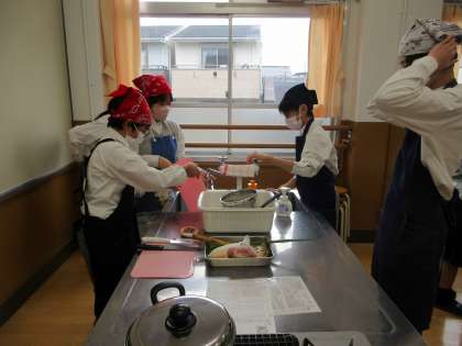 家庭科の授業で調理実習を行い、豚汁をつくりました。協力しながら楽しく取り組むことができました。担任の先生らにも料理をふるまってくれて、職員室にいい匂いが広がっていました。