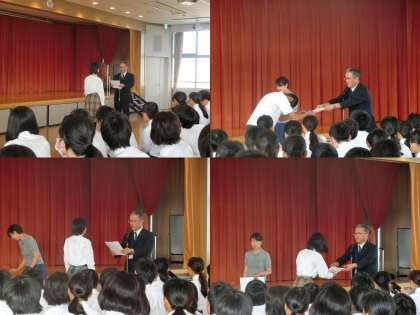 最初に、夏休み以降に活躍した部活動の表彰を行いました。各種目の大会やコンクール他、各教科での取組は今後も引き続き行われます。それぞれ活躍を期待しています。