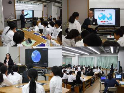 地球一個分で暮らすには・・・をテーマに1年生対象で技術・家庭科の授業を行いました。今回の授業の特徴はタブレットコンピュータを一人一台ずつ使用し、意見交換や意見の集計、発表代表者の選出が瞬時に出来る事です。