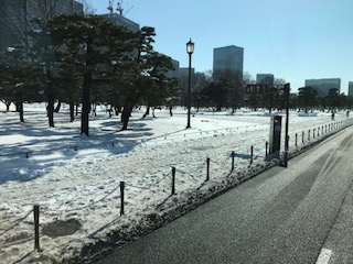 富士中学校に向けて、バスは東京駅を出発しました。皇居前広場も、雪景色!