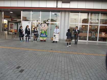 2年生のチャレンジ体験,中京警察署では,交通安全活動の一環で二条駅でビラ配りを行いました。なかなか受け取ってもらえませんが,果敢に色々な人に話しかけに行っていました。この調子でチャレンジ精神を養ってほしいです。
