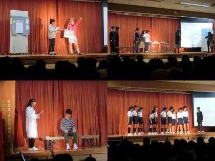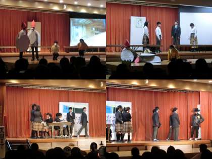 本日午後から、1年生が生徒企画フェスティバルを行いました。この企画は、毎年行っているもので、文字通り生徒による企画のもとに、学年全員が6つのグループに分かれて、それぞれ練習を重ねてきた「劇」を熱演しました。たいへん短い取組期間の中でも、それぞれ監督となる生徒を中心に集中して練習をし、今日の日を迎えたことと思います。監督・照明・音響・小道具・キャスト等、一人一人が、それぞれの役割を理解し、その役割を一生懸命に果たしてくれました。素晴らしい発表になったことをたいへんうれしく思います。