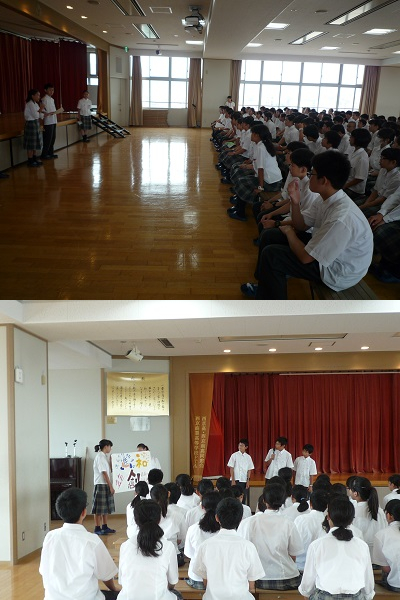 最初に代表委員会より各クラスと学年の振り返りが発表され,その後各クラスの代表の人たちが,学級旗のデザインやそれに込められた思いなどについて発表してくれました。
