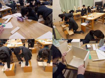 今年の生徒たちは大変効率よく作業が出来ています.また,正確に組み立てるところは近年では一番上手ではないでしょうか.完成したものからほぼ完成まで様々に事後作業に進んでいきます.これから進展が楽しみです.持ち帰った作品は是非とも日常生活で使用していただけますようお願いします