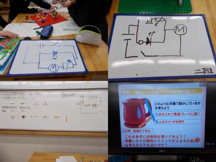 2年生では理科とのカリキュラムマネージメントもひと段落、これから、実際の回路製作へと移行します。今年度もエネルギー変換領域やエネルギー・環境起用育の一環として,独自開発のブロック教材を使って、電気回路の実装と電流の可視化に取り組みました。このブロック教材は、京都市技術科研究会の教材開発の一環として,目に見えない電気を少しでも想像上でも可視化する事と実際に部品に触れて、その場での閃きやアイディアをすぐに具現化出来るようにしています。回路構成では並列接続と直列接続、そして、それに伴う電気消費量の変化を実感でき,計算上の数値と実回路とを比較し誤差や効率の善し悪しが判断できるところです。また、回路を構成するうえで、負荷の違いが電流量に変化をもたらし、並列回路では等価回路にするといった工夫が必要になります。
