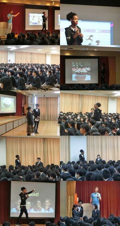 講演は、プログラムインストラクターのKris Kullengren氏と絶妙の掛け合いで、Dee Deeさんご本人の経験から「何事もあきらめなければ必ず夢は叶う」ということを熱く語っていただきました。実際に金メダルもご持参いただき生徒の首に掛けていただくなど、生徒のみなさんも大変感激した様子でした。