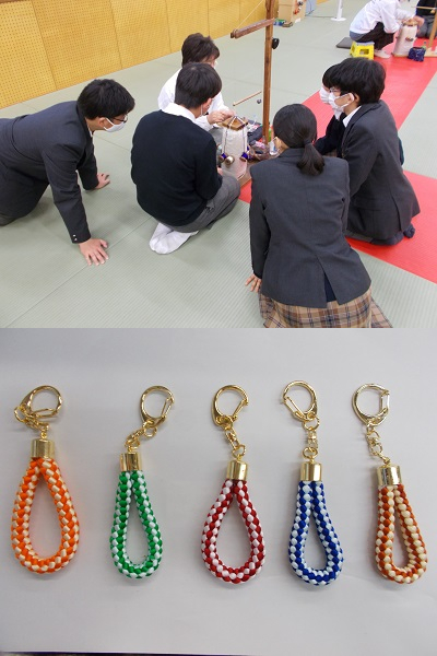 武道場に7つの台を準備していただき、ひとりひとりやり方を教わりながら、組み体験をしました。見ているときは簡単そうでしたが、実際にやってみると、難しかったようです。丁寧に教えていただきながら仕上げ、2色の色鮮やかなキーホルダーができました。また色々な質問にも丁寧に答えていただきました。