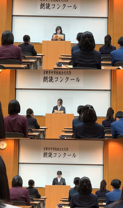 11月6日(土)京都市中学校総合文化祭の一部門として,第33回京都市中学校朗読コンクールが京都市総合教育センターにて開催されました。各学校より現代文の部に2名,古典の部に1名のエントリーが可能で,本校では放送部より3名が出場しました。国語の教科書にある作品から、発表する作品を選びます。