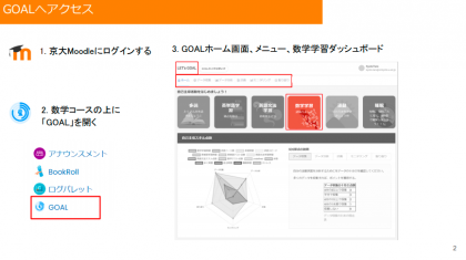 数学科では,毎週月曜日の朝学習の時間に「数Sマンデー」を実施しています。前週の問題集の課題範囲からの出題で,7分間の取組のあと,相互採点し,その結果をGOALシステムに入力します。GOALシステムに入力することで,自身の学習履歴を知ることができるとともに,仲間の学習状況と比較することができ,継続的・計画的な学びの一助となります。また,自身の推移をみることで,弱点を分析し,テスト前などでの学び直しで効率的に学習に取り組むことができます。