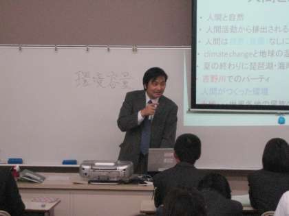 植田先生は「環境と経済を考える」というテーマで,私たちがいかに環境と深くつながっているかを,人間と自然との具体的な関わりの事例を通してわかりやすく説明していただきました。また,環境の価値について考えたり,地球環境問題を解決する上での課題や方法についても示していただきました。