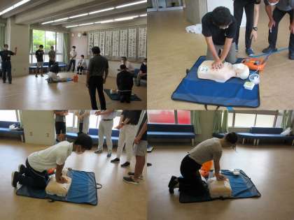 「中高合同研修」、「評価について」「生徒指導にかかわる研修」、「普通救命講習」の様子です。