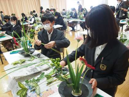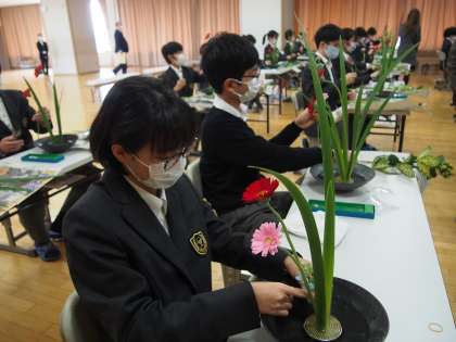 池坊華道教授の塩野先生による指導を受けながら、花を切って生ける体験に緊張感をもって取り組んだ1年生でしたが、自身の作品を前にした表情はすがすがしく、しっかり感性を磨いていた様子です。持ち帰ったお花を家でどういけて飾るのか楽しみですね。