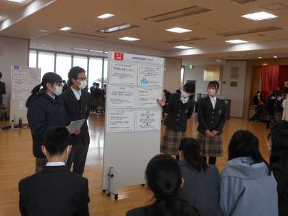 2年生が集合した場では、司会者から「NO原稿で相手を意識した発表をしていきましょう!」、「コミュニケーションをしっかりととっていきましょう!」の声掛けがありました。2年生だけでのセッションの段階では、まだ笑顔が多かったのですが、7時間目、1年生や保護者を前にすると、一気に緊張が高まったようでした。なかには1年生や保護者から質問が出て、活発に質疑応答がされているグループがありました。