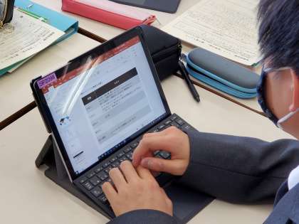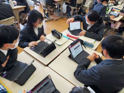 社会科の授業では、事前にパワーポイントで世界地図の資料を配信しました。これをもとに、個々が考えるエリア分けとその理由について、班ごとに発表と意見交流を行いました。それぞれが工夫された報告で、また今までの知識をもとにして様々なエリアに対し、的確に相互評価がなされていました。今後もみなさんが新しく得た知識を、自分の中でどのように咀嚼していくのか、楽しみにしています。