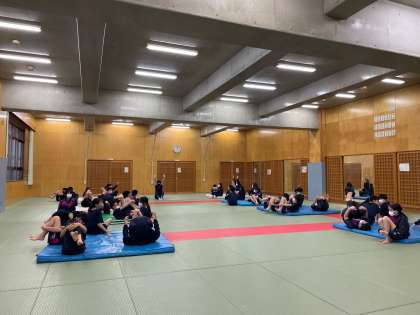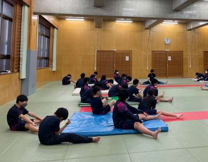 1年生体育で、マット運動が始まりました。準備体操の後、マットを敷いた上で、足を抱えたり、伸ばしたりしながら、柔軟運動と回転への予備運動を行います。上手にブリッジをする子もいて、それを見た周りの皆から拍手が起こっていました。前転を始める頃には、順序よくコロコロと回り始め、本当に楽しんでいる雰囲気が伝わってきました!