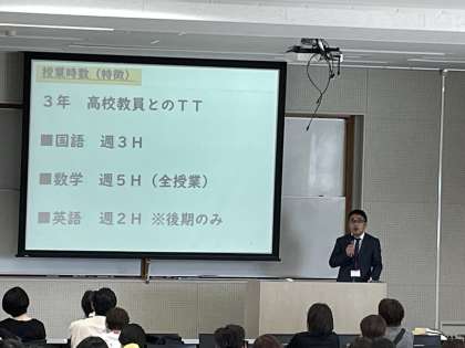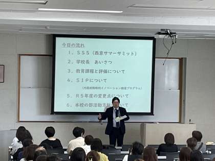 5月12日(金)の午後、約200名の保護者の皆様に参加いただき、教育課程説明会を開催しました。何ができるようになるためにどのように学ぶのか、子たちの学びを見通す力を育むため、学びのめあて、年間評価計画をmoodleにアップしています。自分が今何が足りないかに気付き、取り組むことこそ、主体的な学びの第一歩です。困った時は、先生や周りの人々に力を借りつつも、粘り強く取り組む姿を応援していきます。なお、SSS【西京サマーサミット】のご案内も行いました。子たちの英語力アップに向け、ネイティブの先生と密に学べるチャンスとなっています。是非ご検討ください。