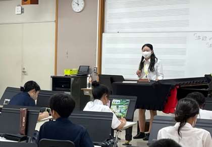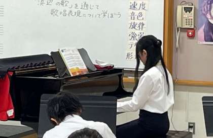 金曜日、3週間にわたる教育実習が終わりました。この日は、音楽、社会のそれぞれの実習生が、大学の先生をお迎えして研究授業に臨みました。音楽では、「浜辺の歌」を歌うにあたり、どのように歌えば曲想が伝わるのか、先生の独唱を聞きながら考えました。写真は、先生がピアノを弾きながら歌う様子です。きれいな声でしたね。歌を聞いて、波の音の表現をメロディラインの高低の繰り返しから感じることができる、と答えてくれたときには、たしかにそうだ、と納得しました。