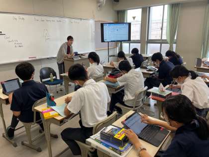 1年生の英語では、ロイロを使ってテキストに含まれる複数形を見つけ、その違いを確認しています。先生が発音してくださる音とともに、複数形のスペルを確認します。