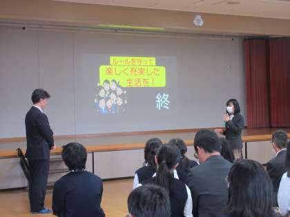11月13日(月)7限に講師の方をお招きして、非行防止教室を行いました。講義では“いじめ”や“スマホ・SNSの危険性”“闇バイト”について、具体的な事例を挙げて話をしていただきましたが、全体を通してみんなに問われていたのが「社会にはなぜルールがあるのか?そして、なぜルールを守らなくてはいけないのか?」でした。誰もが自分の思いどおり、やりたい放題の世の中では社会の秩序を維持することはできません。ルールは自分自身だけではなく大切な周囲の人たちも含めて、安心して安全に社会生活を送るためにあるものです。そんな大きな問いと、そしてそれを実践していくという宿題をみんなは受け取りました。この授業で聞いたことや考えたことを心に刻んで今後も生活していきましょう!