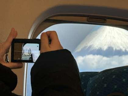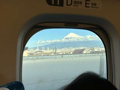静岡を通過中です。富士山が綺麗に見えています。生徒から歓声があがりました。天気が良くてよかったですね。
