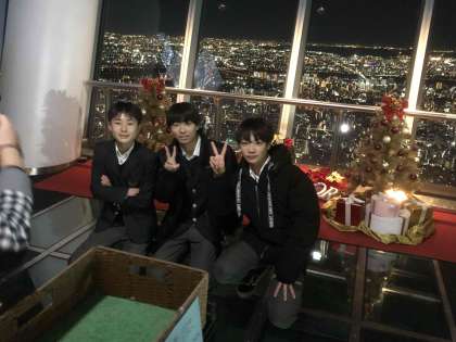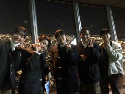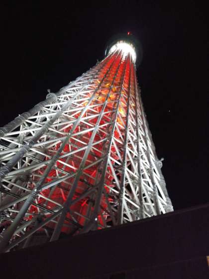 1日目の最後の行程は、スカイツリー。最上階での展望や下からスカイツリーを見上げるなど堪能しました。地上350mから見る東京の夜景はとても綺麗でした。