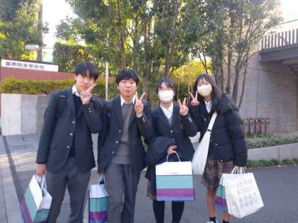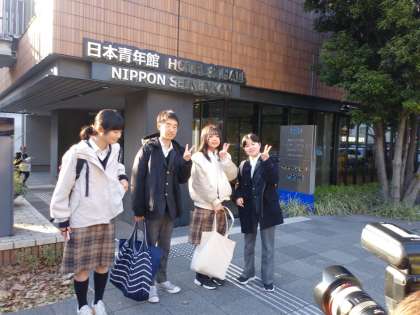 都内班別研修1日目を終えてホテルに到着したグループです。いい表情ですね。学び深きものになったことでしょう。