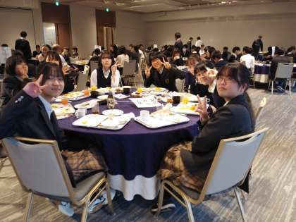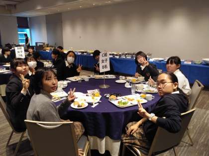 ブュッフェ形式の朝食でやや疲れの様子が見えますが、食事の場で同級生と顔を会わせて話をすると元気になっています。2日目の東京都内研修と散策の話で盛り上がっています