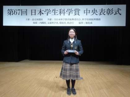 本日、第67回日本学生科学賞の中央表彰式が、東京の日本科学未来館で行われ、3年生のSさんが、内閣総理大臣賞を受賞されました。先週の東京研修旅行中の最終審査を経ての受賞です。1年以上、ヌマチチブを育てながら高度な研究機関を頼るのではなく、地道に研究を続けたことと、仮説→検証のサイクルを幾つも重ねたこと、そこから導き出したヌマチチブの個体識別能力に関する考察が評価され、中学の部で最も優秀である研究に送られる賞の受賞になりました。おめでとうございます。
