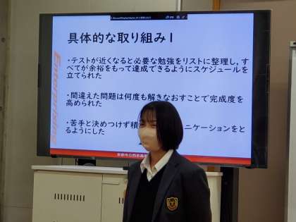 振り返ることができるって、すごいことだと思います。実行することも大切ですが、社会に出ると、いつでも自分の行動や判断、意見について、誰かが評価してくれるわけではありません。自分で自分自身のことを見つめなおす習慣のある人は、自身の言動に自信が出てきます。今回のプレゼンテーションでも自信をもって発表している姿を多く見ました。ぜひ、振り返る習慣を身に付けてください。そこでポイントになってくることは、自分を肯定的に評価することです。