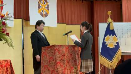 さて、本校の校是である「進取・敢為・独創」の考えのもとに、新入生のみなさんはこれからの6年間、どんな学校生活を送ることになるのでしょうか。学校長の式辞にもありましたが、自分のやりたいこと、やるべきこと、やれることをしっかり考え、実行することは、達成感や成就感を得ることにつながります。この先、勉強に、部活に、その他様々なことに一生懸命に励む新入生の皆さんには、楽しいことばかりではなく、悲しいこと、苦しいこと、様々な困難が待ちうけているかもしれません。そういう時こそ、あきらめたり、逃げたりたりせずに現実を受け入れ、心を落ち着かせるとともに、新しいことにチャレンジすることが、『おもしろおかしく』過ごすことができるための方法です。