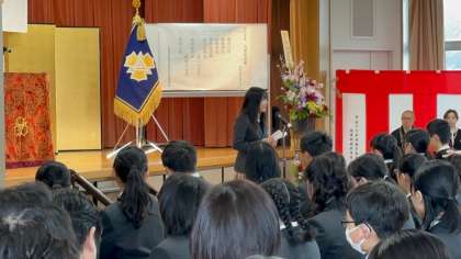 昨日から今朝にかけて降っていた雨も、新入生の皆さんが登校する頃には止み、これから始まる21期生の西京生活のスタートを祝うかのようでしたね。入学式の前、新入生は式中の作法や、校歌の練習を行いました。その際には生徒会本部役員の生徒達も活躍してくれました。写真は、新入生を代表して誓いの言葉を話してくれたTさんと、在校生を代表して歓迎の言葉を話してくれたNさんの様子です。