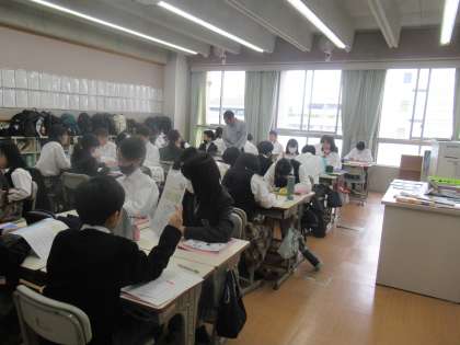 参観にもたくさんの保護者の皆様がお見えになりました。1年生の元気で、前向きな授業への姿勢を見ていただけたのではないかと思います。道徳の授業では、これから1年間の見通しと、部活について悩む「拓哉の悩み」を学習しました。本日の心のテーマは「自分で考え選択する大切さ」です。仲間と議論しながら、真剣に考えることができていました。