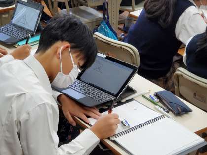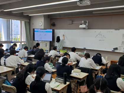 相似の発展として、チェバの定理やメネラウスの定理をうまく活用して、課題解決に取り組んでいます。補助線を引いて相似を繰り返し利用し解き切る力も必要ですが、一方で強力な定理を用いて鮮やかに解くことも大切です。高校の範囲に片足を突っ込んだ状態になっていますが、皆さんの理科度なら大丈夫。わかったつもりにならず、貪欲に挑戦していってください。