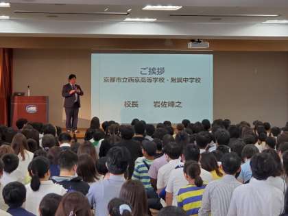 本日、学校説明会を行いました。暑い中にもかかわらず、2000人以上の保護者・児童の皆様にご来校いただき、まことにありがとうございます。本校では、「進取・敢為・独創」の校是のもと、未来社会を創造するグローバルリーダーシップの育成を目指し、日々教育活動を続けています。京都市立唯一の中高一貫校として、特色ある教育課程を編成しています。本日の学校説明会をきっかけとして、西京に行きたいという意思が高まってくれていると、うれしい限りです。